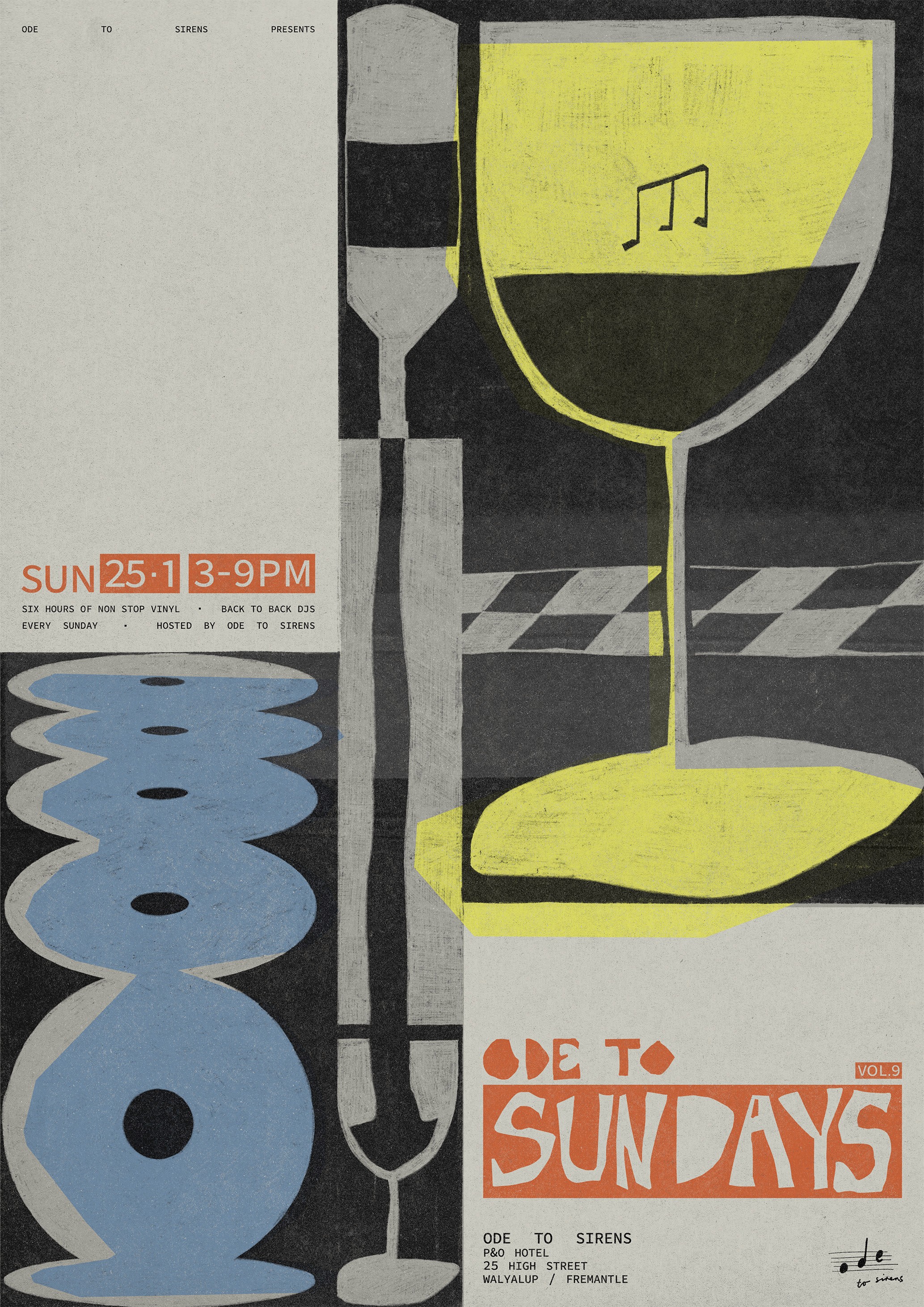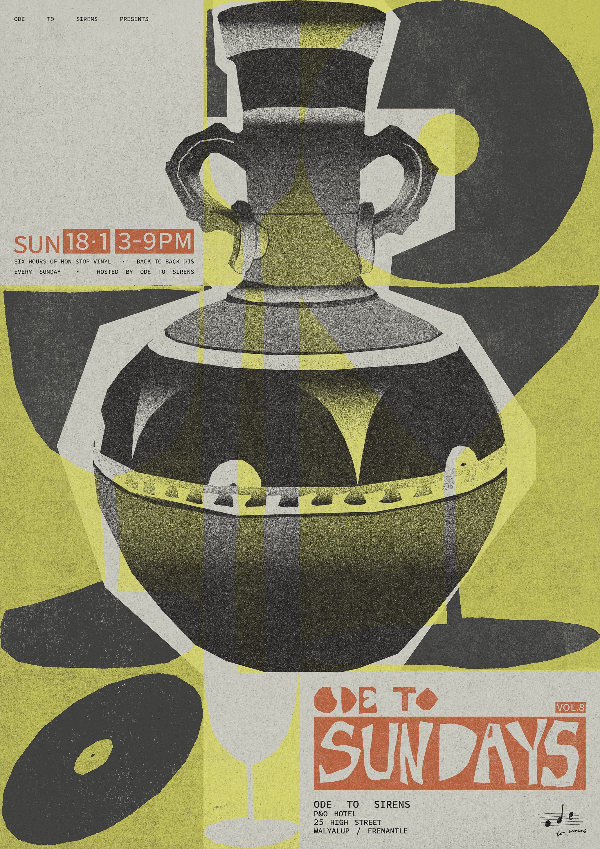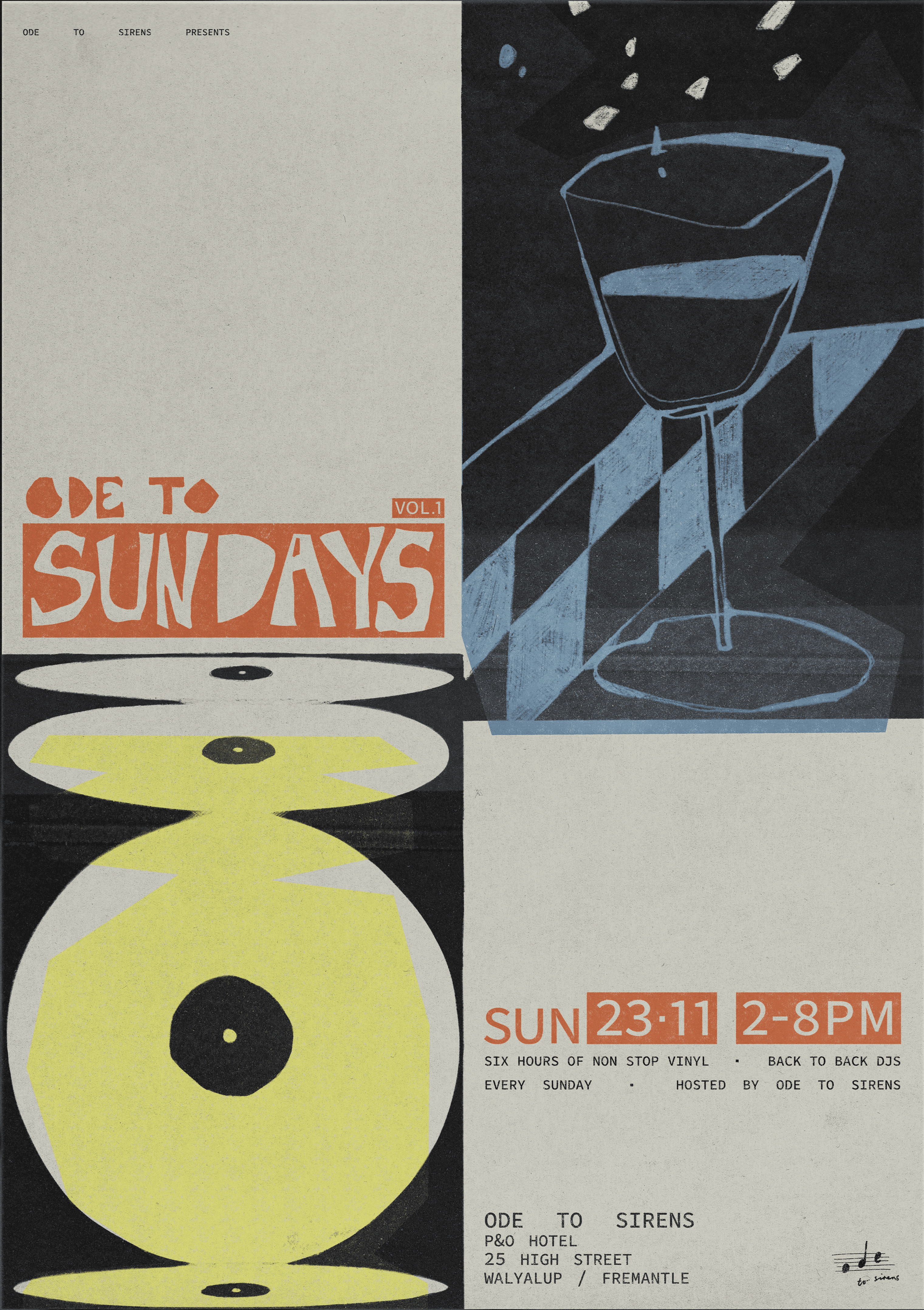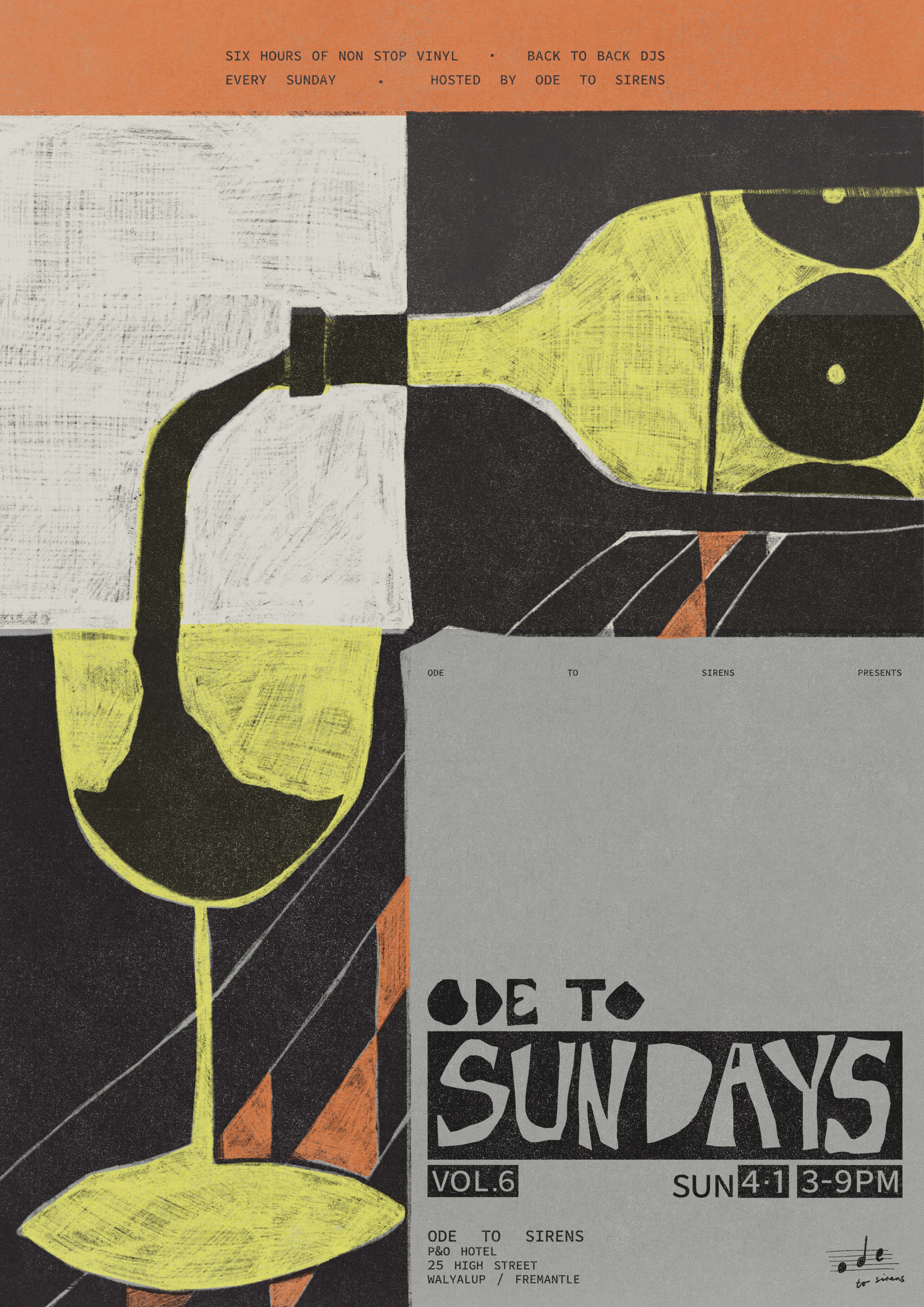 Ode to Sundays is a Sunday sesh style event hosted by Fremantle bar/restaurant 'Ode to Sirens' which specialises in Greek wine, food and a wide range of vinyl records. The goal for this project is to develop an individual branded identity for Sundays on its own, with a range of weekly event posters and lineup posts. The identity and rollout of Ode to Sundays considers the existing Ode to Sirens branding, reimagined to be brighter, more playful and indicative of a summer arvo, targeting a much younger demographic.