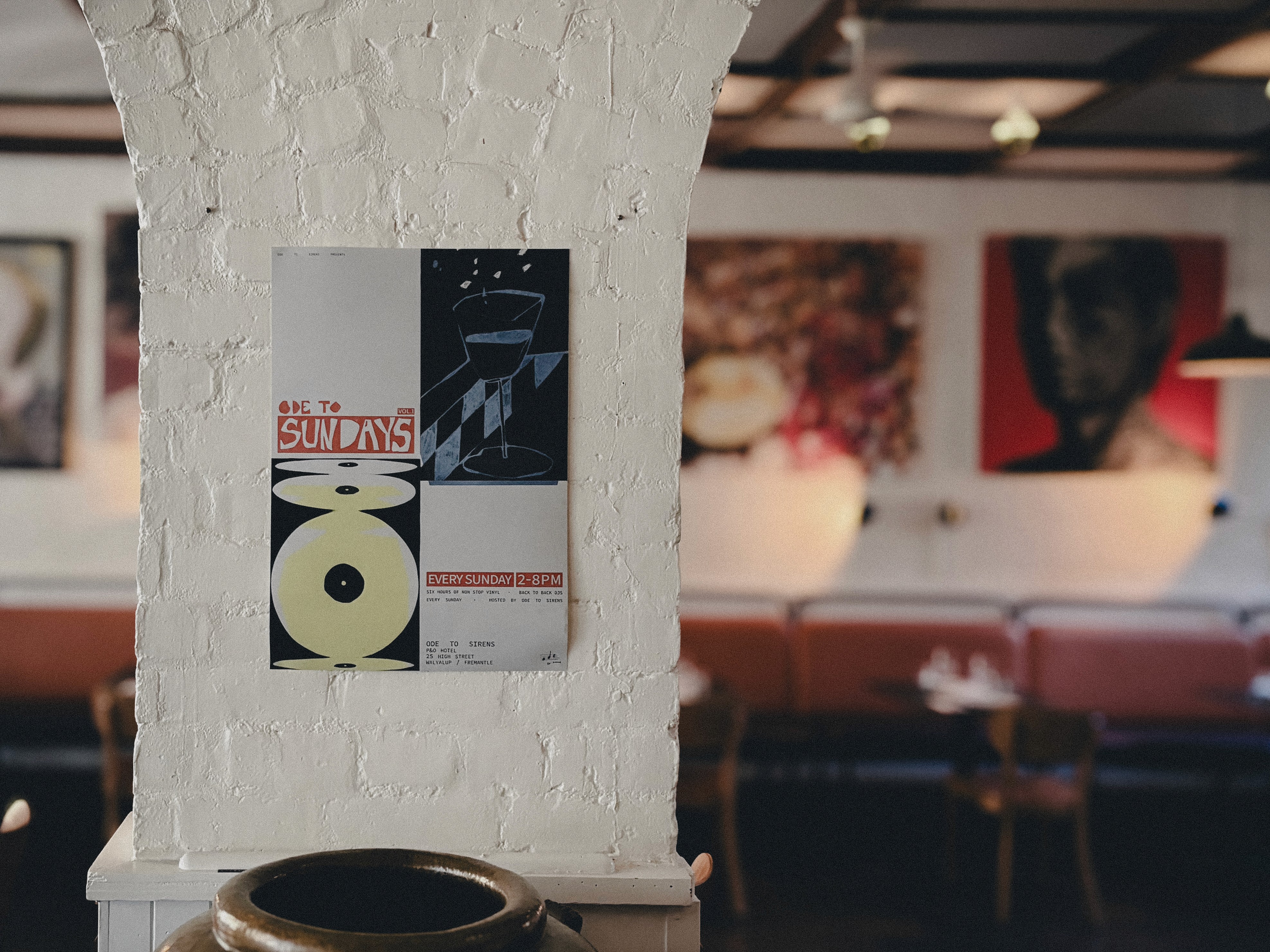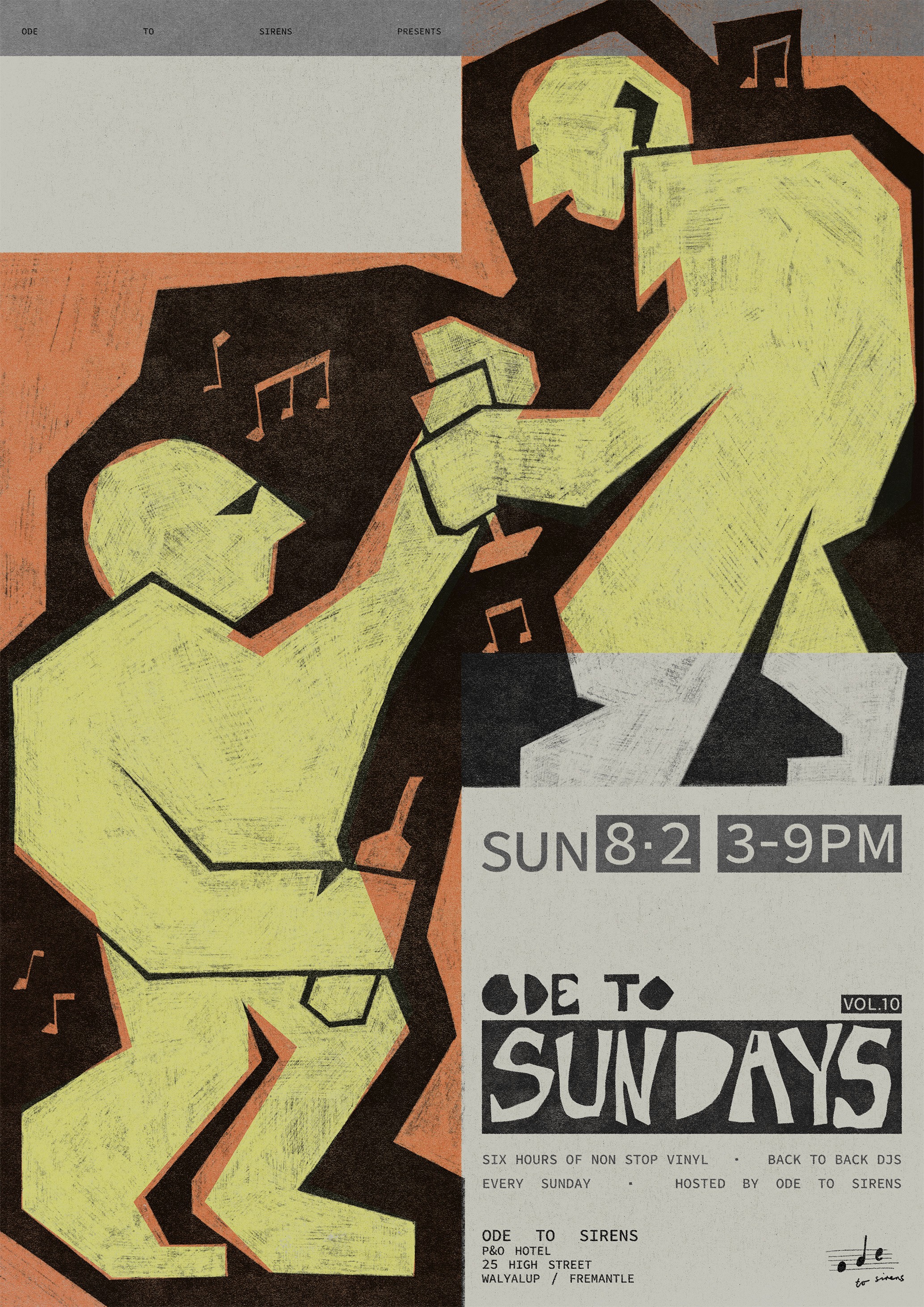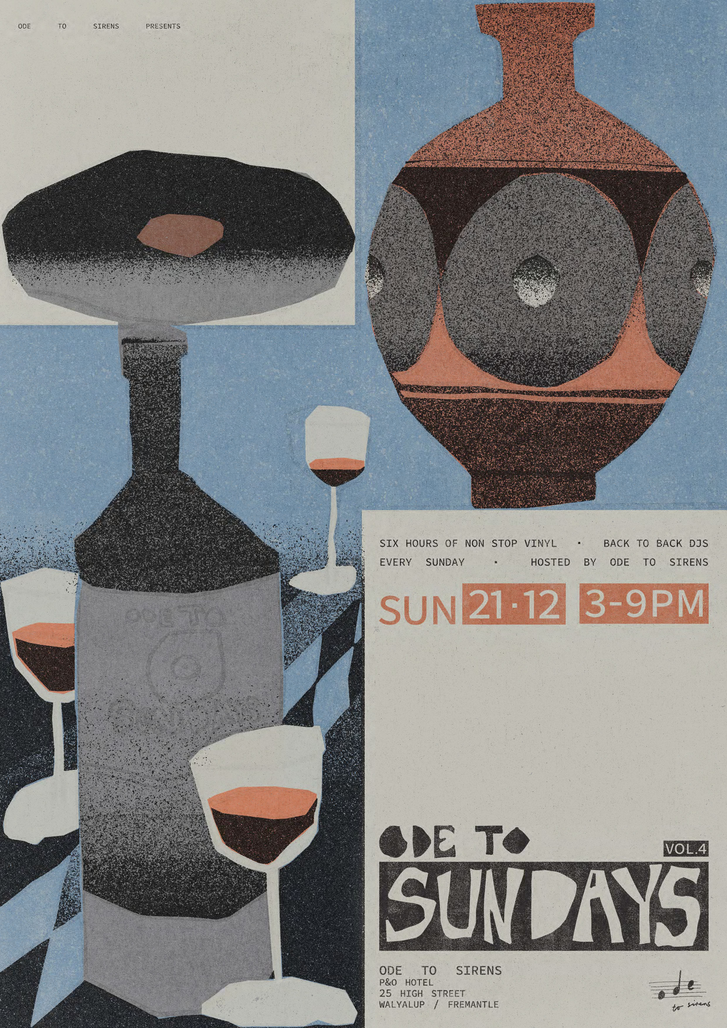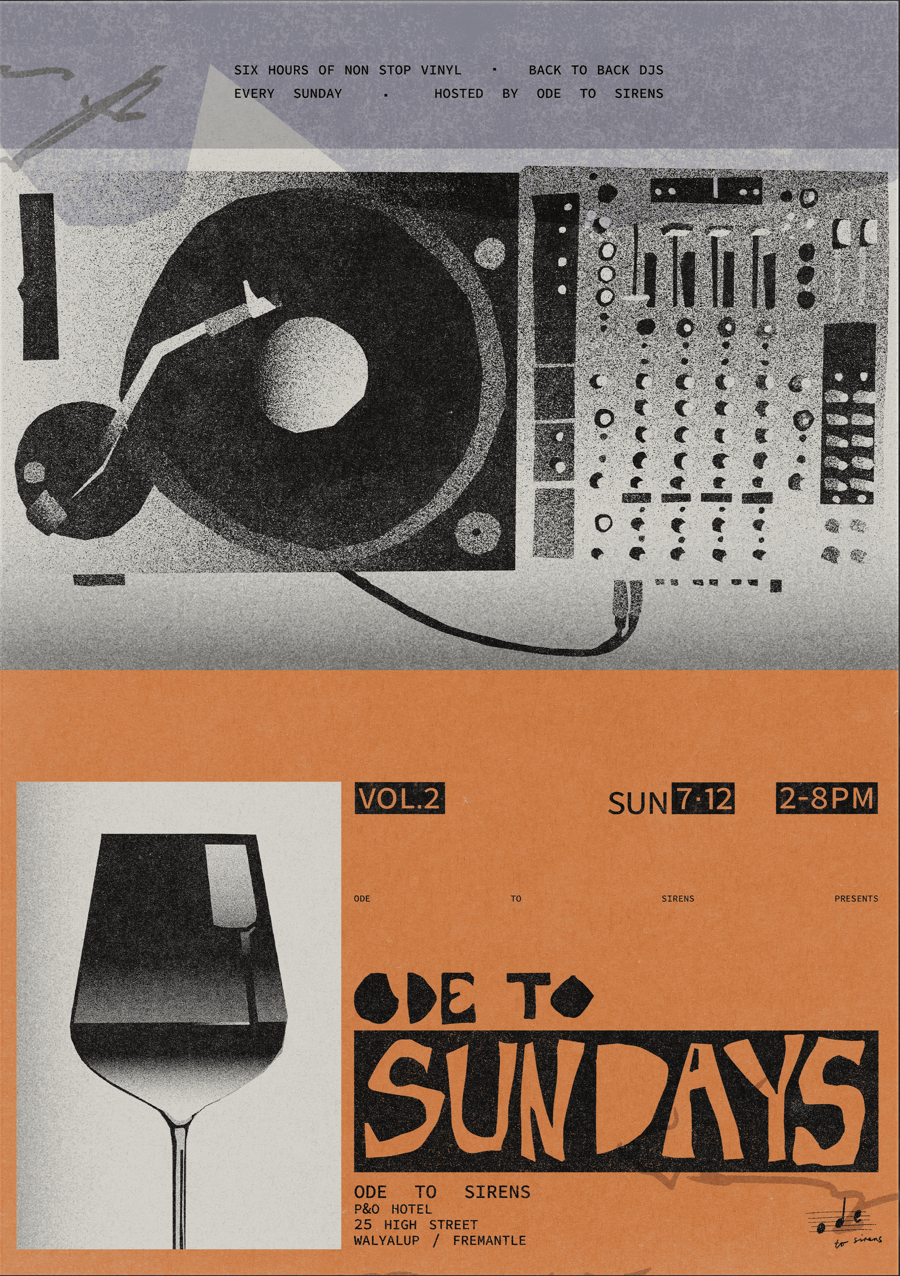 Ode to Sundays is a Sunday sesh style event hosted by Fremantle bar/restaurant 'Ode to Sirens' which specialises in Greek wine, food and a wide range of vinyl records. The goal for this project is to develop an individual branded identity for Sundays on its own, with a range of weekly event posters and lineup posts. The identity and rollout of Ode to Sundays considers the existing Ode to Sirens branding, reimagined to be brighter, more playful and indicative of a summer arvo, targeting a much younger demographic.